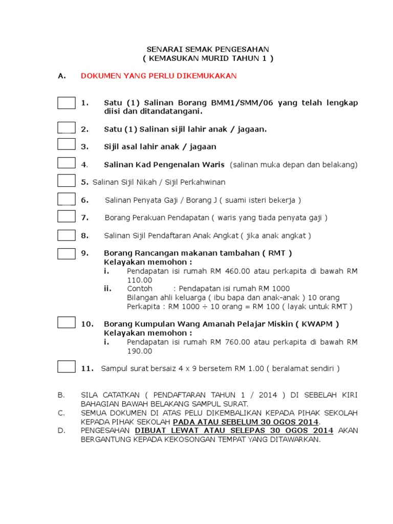 Senarai Semak Borang Pendaftaran Tahun 1 Pdf