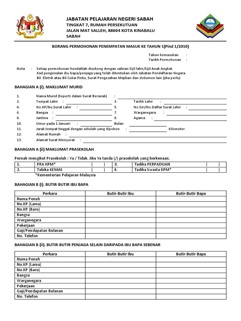 Borang Permohonan Masuk Ke Tahun 1 Pdf